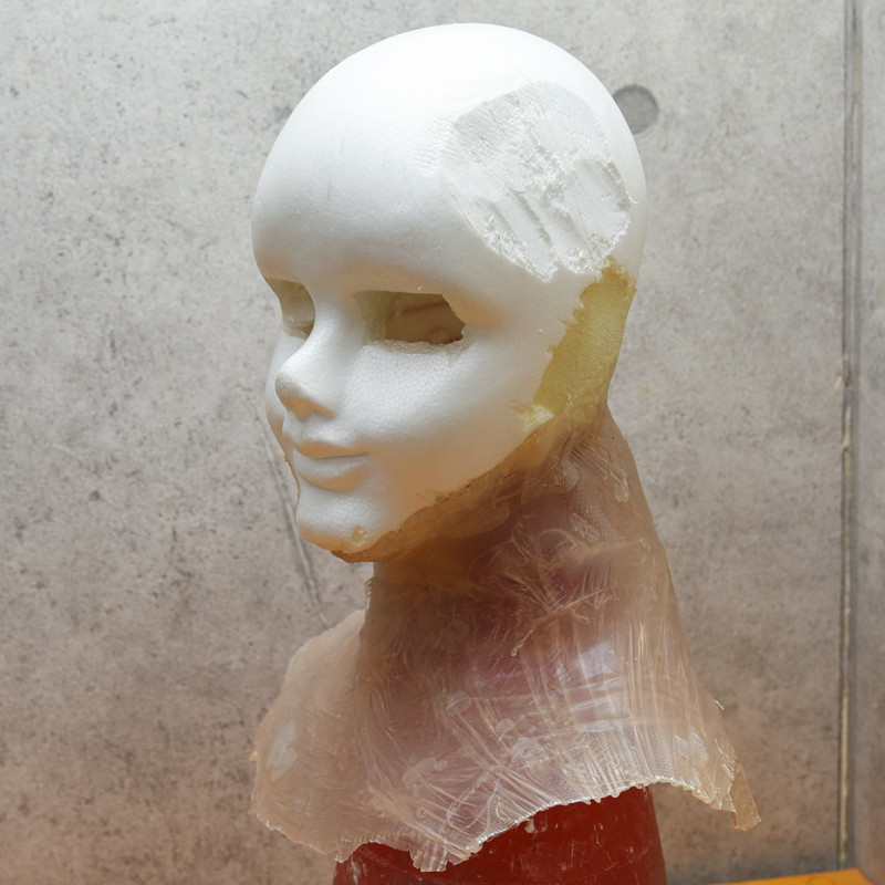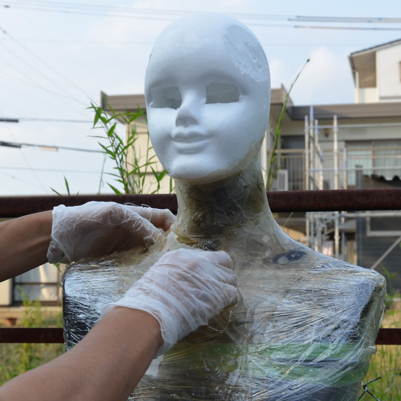 次は、マネキン側の準備。5. 頭を取り外し、養生テープやサランラップ等で汚れを防止する。