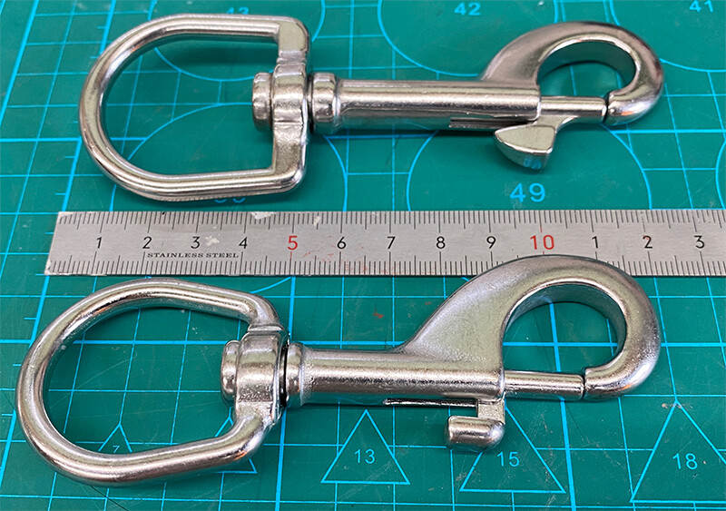 これまた細かい話だが、ターミネーターのM65の肩に着けられていた鉄砲ナスカン。XLと2XLは126mm、S〜Lは100mmを使う予定だった。通常、100mmの次の番手は126mmで、二つを入手して近い方の126mmがオリジナルサイズとしていたのだ。が、もう一度映像や写真から正確に割り出したら115mm程度だと判明。誤差を考えても100mmや126mmではない。よくある嫌煙学会データのように結論ありきで計算してみたけど126mmにはならない(^^) ので海外から何とか115mmを探し出して入手した。結果、L〜2XLは115mm、SとMのみ100mmを使用する。