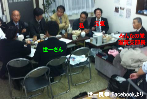 私(無所属)と北川元気市議(龍馬プロジェクト)は彦根市の「第三極」として活動中。地元の選挙区からは、世一良幸氏(みんなの党)が出馬するので、彦根支部長として応援させていただく。