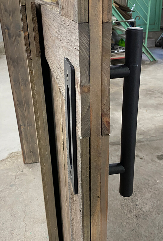 取っ手はとりあえずバーンドアによく使われるタイプで。子供が大きくなったら表の縦棒を鹿の角に交換するつもり。