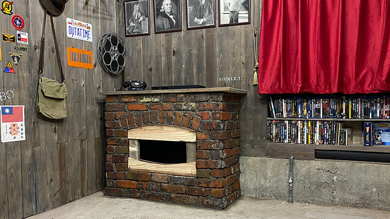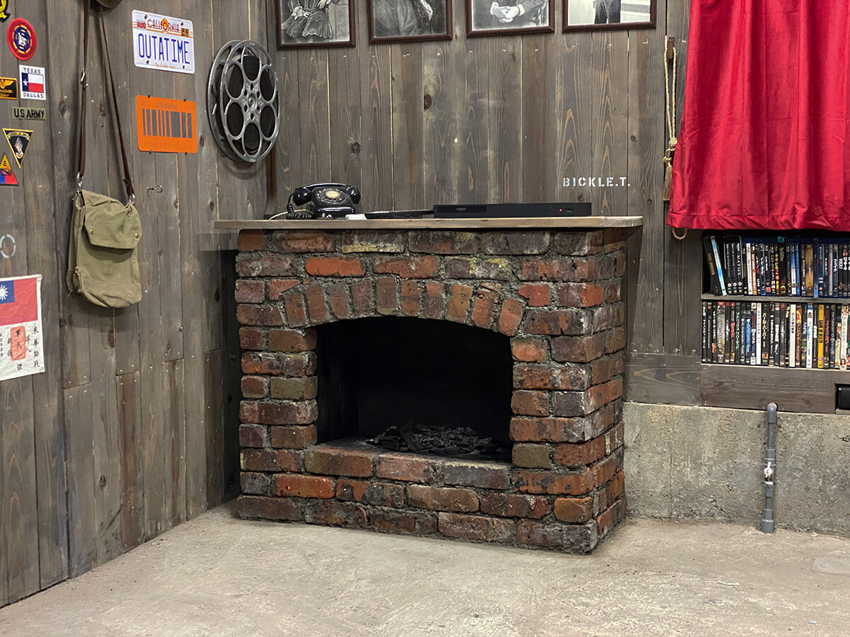 内部は暖炉が買えるまで我慢できるよう、合板の端材でかまど風に仕上げた。マントルピースは奥に煙突がある体(てい)なので、真っ黒にして奥行き感を出した。アンティーク調レンガを使ったので、廃線