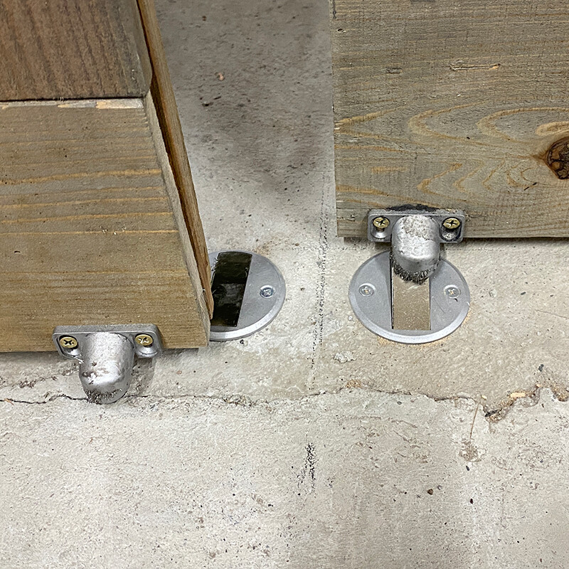 今回のバーンドアは下にレールやガイドがなく、上部レールはドアの重心ラインからずれているので、特に外側のドアは垂直に吊り下がらない。その対策として開き戸用の磁石のストッパーを使うことにした(閉めた時)。写真右の留めた状態が垂直で、何もしないと左のようにかなり手前に来る。ストッパーはオートマティックでしゃがむ必要なし。