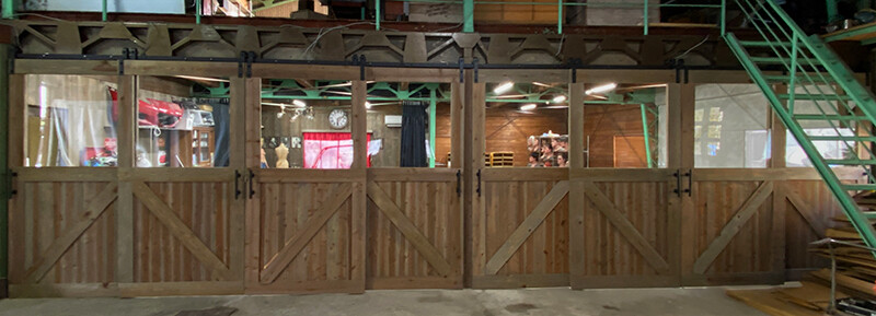 条件としては車のドック入りやリフトでの大型荷物を搬入があるので、少なくとも左側は全開できるようにしたい。が、大きな開閉ドアはスペース的に厳しく、シャッターやガレージドアは大きな窓が付けられず、閉鎖的になりすぎる。となるとガラスの折れ戸が理想的なんだけどDIYするとしてもレール等の金具だけで10万を超える。さらに土間が少し傾斜しているので下レールが必要なドアは使えない。