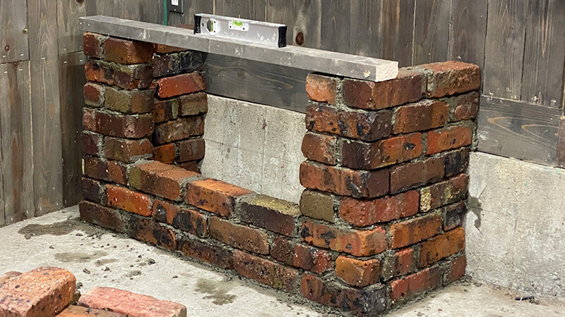 水平を取りながら、モルタルじゃなくて敢えて砂利入りのコンクリートで積んでいく。レンガを半分に割るのはカットチゼル(右)で簡単にできるが、斜めとかは上手くいかなかったので、グラインダーで切れ目を入れて割った。