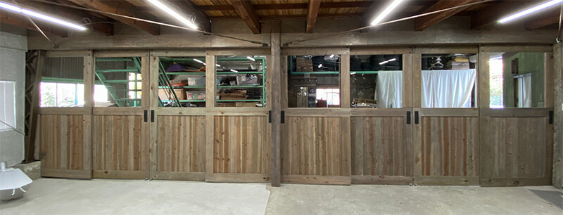 結論として“バーンドア”と呼ばれる納屋風の吊り戸をDIYすることにした。当初はミリ単位の作り込み不要のアメリカンスタイル的な軽いノリだったが、レールの設置が10m近く必要で、2.5mの高さの最大8mm厚の鉄骨にひたすら穴を開ける作業は椎間板ヘルニア持ちの五十肩には最早修行であった。