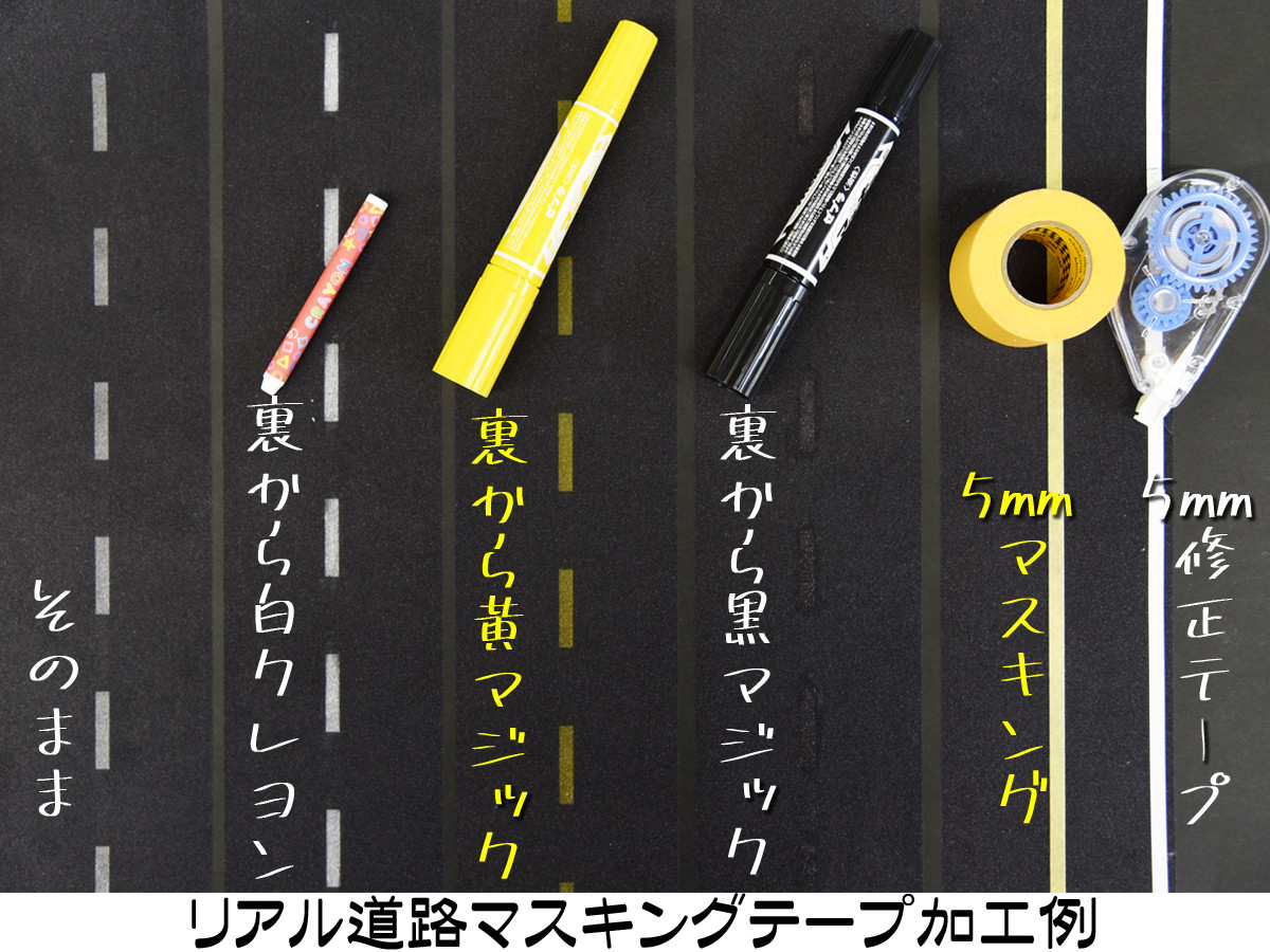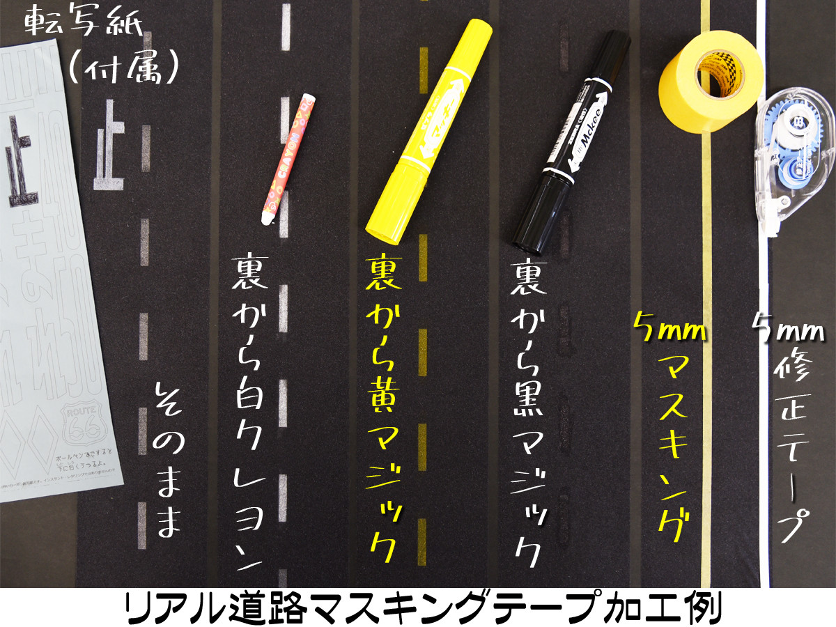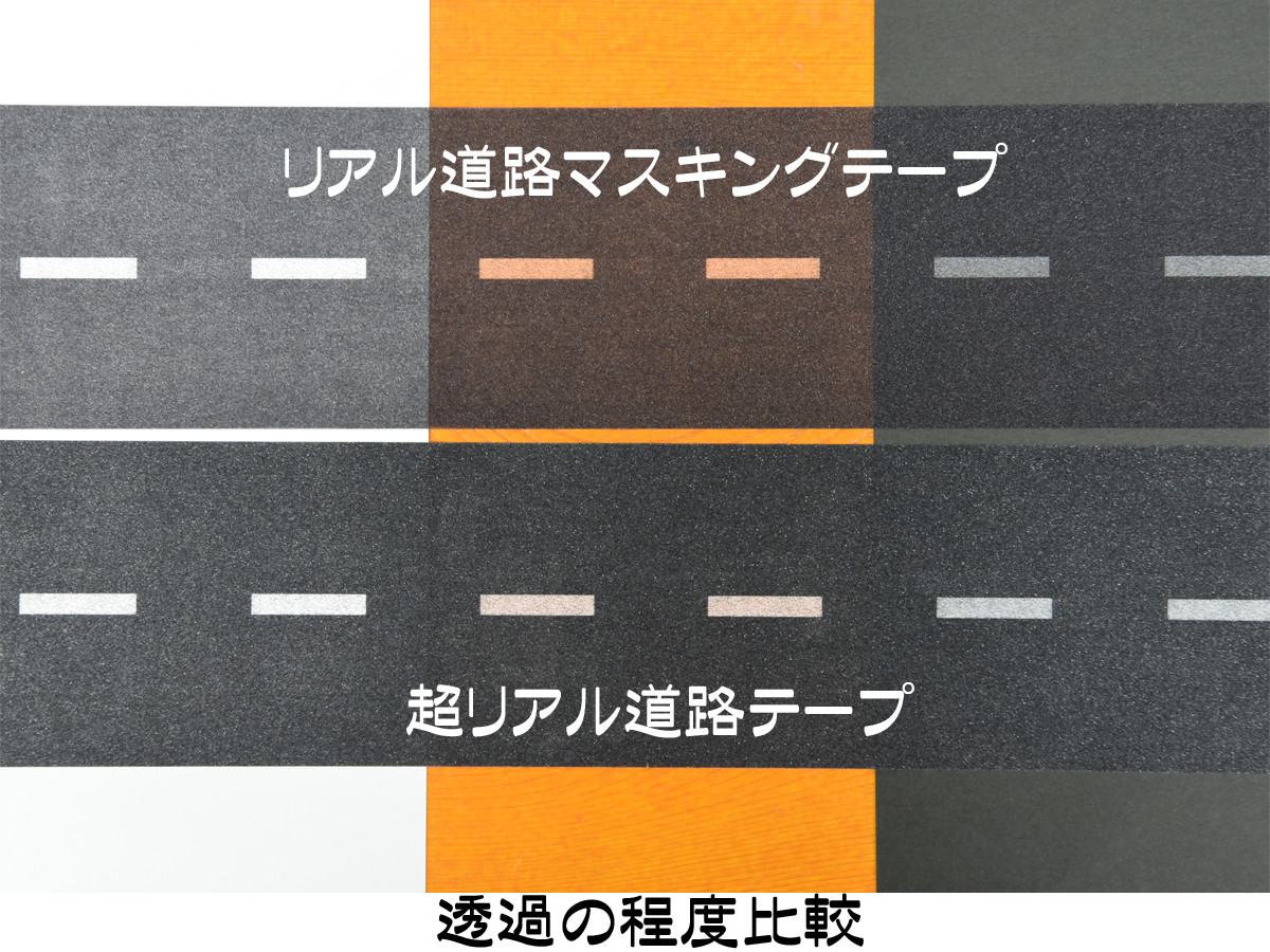 通常のマスキングテープと同じ薄さの「リアル道路マスキングテープ」はたっぷり20m、白破線部分が透けるので下地は白か黒がお勧めなのだが、逆に薄さを利用して様々な加工ができる。厚さ約2倍の「超リアル道路テープ」はアスファルト感も2倍でほとんど透けない。もちろん上から色塗り等が可能。