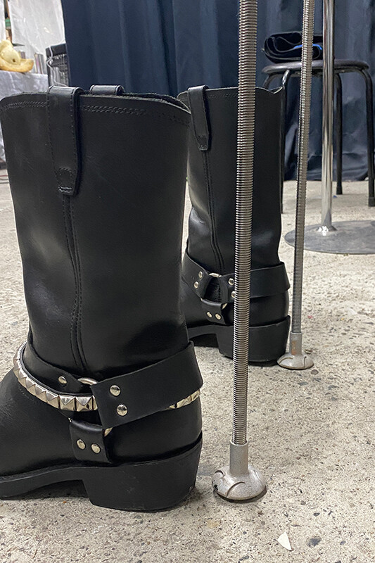 YouTubeの撮影の時のマネキンは、コンクリに穴開けて鉄の棒で支えている。普通のマネキンは自立するが、フレキシブルマネキンに重い胸像を乗せているので、結構しっかり固定しないと倒れてとんでもないことになる(実は過去に何度かあるが、スターをリスペクトしてお見せしてないだけである)。靴に穴を開けてマネキンを貫通させると見栄えもいいのだが、常設ならともかく2〜3回の撮影にしか使わないので‥‥。いずれにせよ、この地面からの棒への固定だとと後ろ姿が逆光かつ接写になるという問題がある。で、